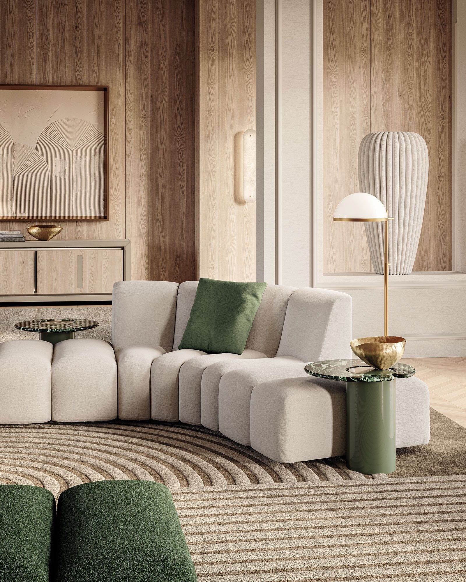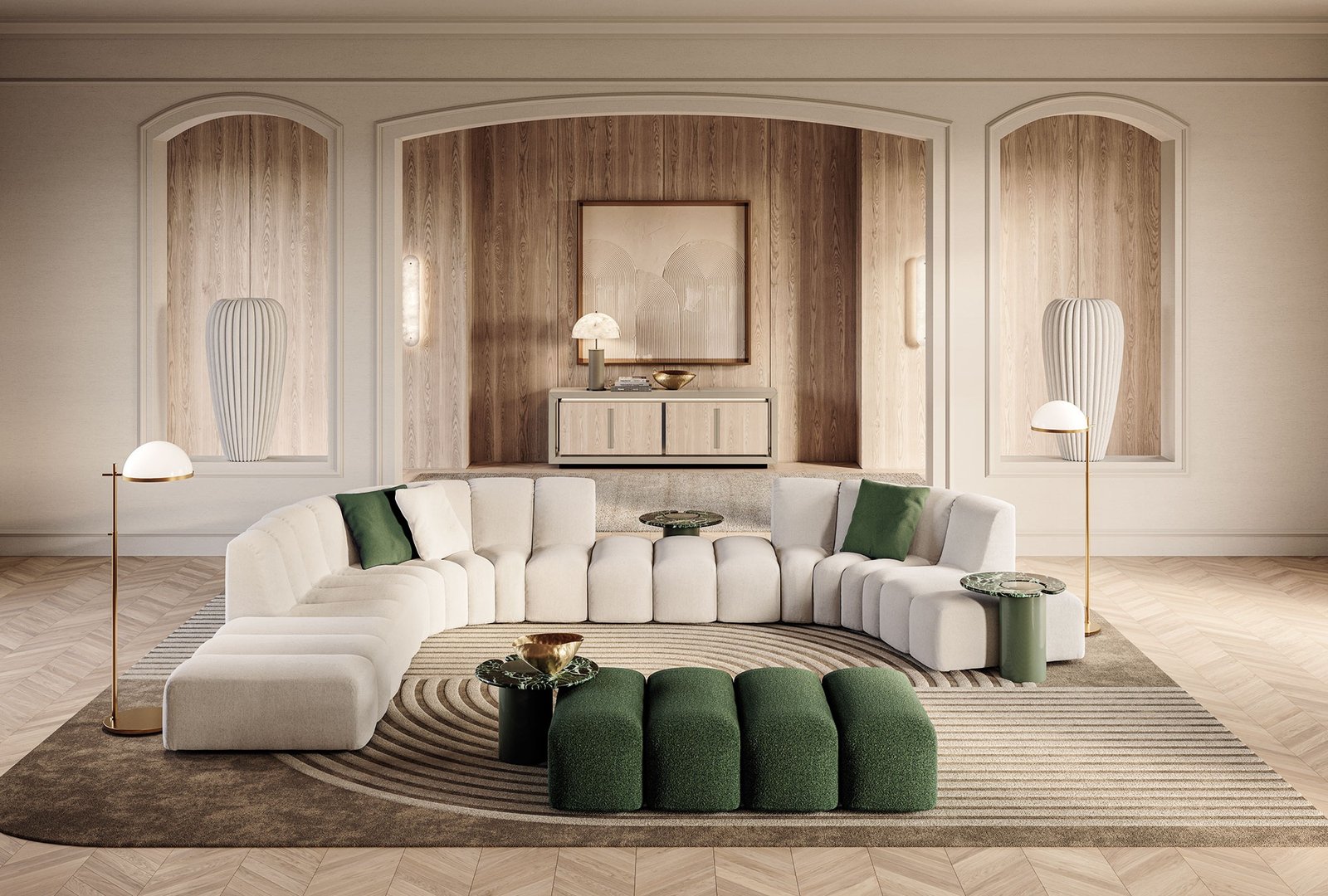 Its plush, structured cushions create a rhythmic, gallery-inspired aesthetic, while the spacious layout offers generous seating for upscale entertaining. The soft neutral upholstery paired with deep green accents delivers a harmonious balance of warmth and luxury.